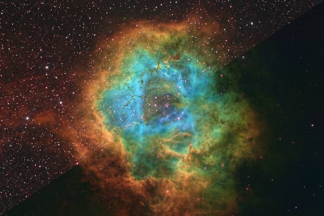 Practice files for stacked deep sky astrophotography post-processing. This is the Orion Nebula (M42), obtained using a monochrome Ha and OIII filter setup.