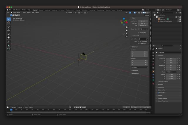 - When using the Nishita Sun Lighting startup file, the World shader is set up to use the Nishita lighting model with some adjusted values: higher sun elevation, increased Ozone layer strength, and reduced Background strength so the lighting is more suitable for the default scene exposure.
